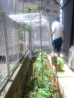 梅雨が迫ってきてるので、トマトに屋根を付けました。
