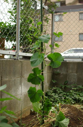 2代目キュウリは絶好調です。雑草にツルが絡むやんちゃぶり。