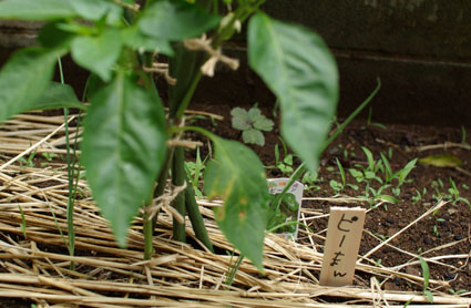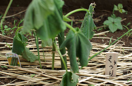 背丈が高くなってきたので、また麻紐で支柱に固定しないと。