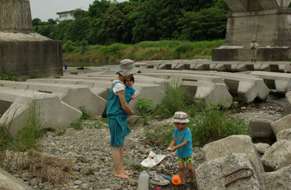川の水が良い感じに溜まってるとこで、おたまじゃくしとかメダカ的な