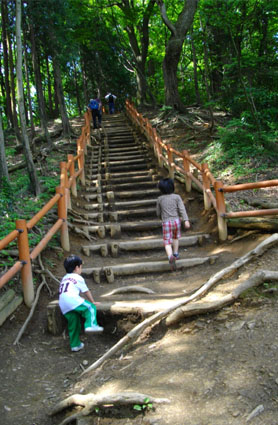 頂上直前の最後の階段。ジャイアンツTシャツで登る息子。